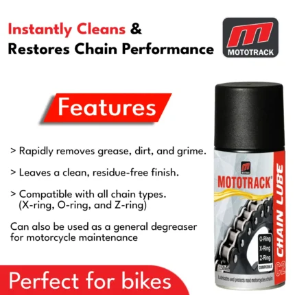 Mototrack High-Performance Chain Lube is a premium synthetic lubricant designed for motorcycle chains, offering superior protection, reduced wear, and enhanced performance under extreme conditions. Suitable for O-ring, X-ring, and standard chains.